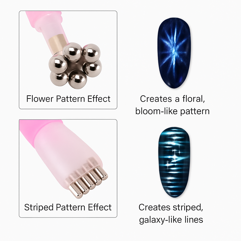 Crafted with strong neodymium magnets, these tools deliver a powerful and precise magnetic pull that activates the metallic pigments in magnetic gel polish instantly, helping you create clean, vivid, and multidimensional designs in seconds. Whether you’re aiming for sleek lines, blooming galaxy effects, or playful flower auras, these magnets respond effortlessly to your artistic direction.