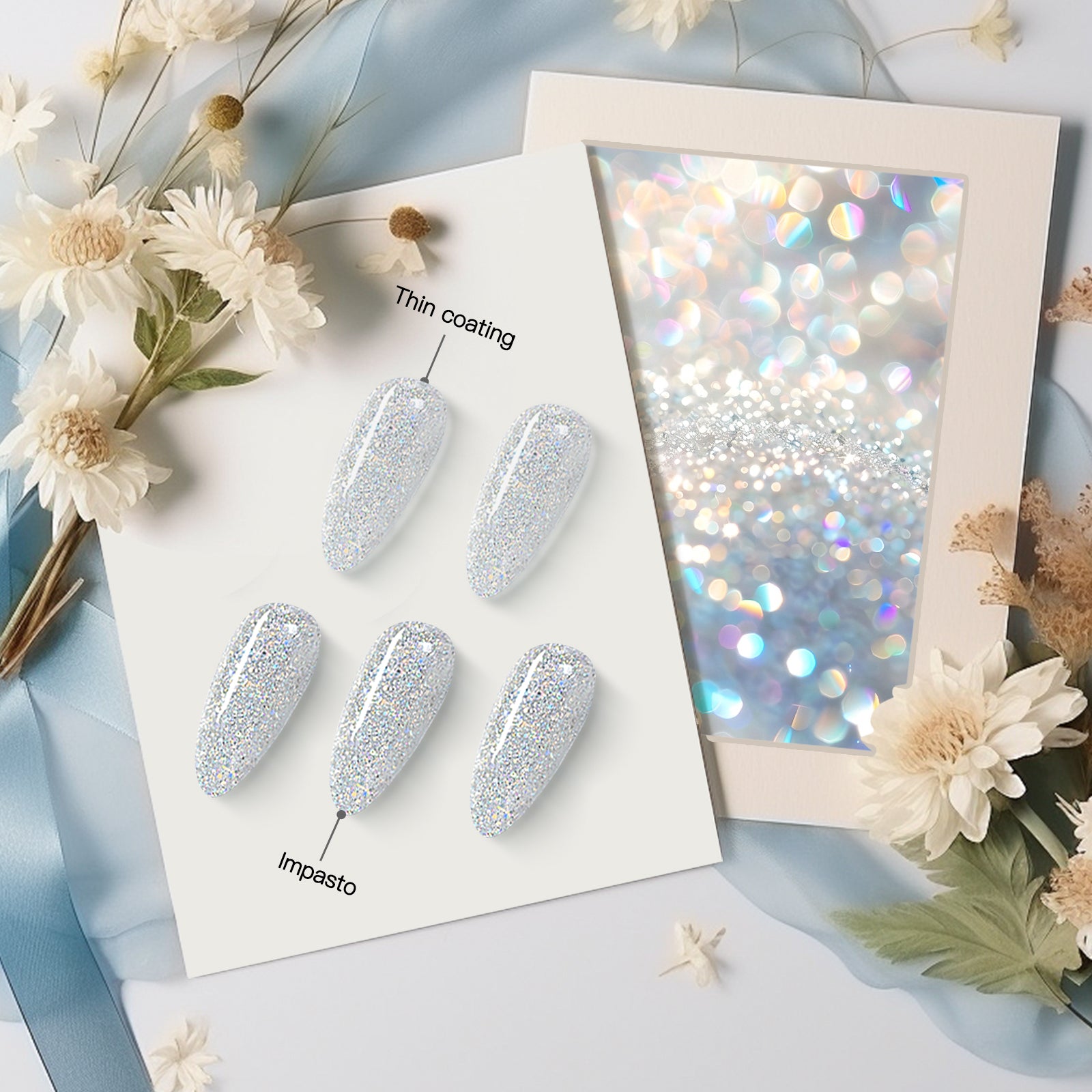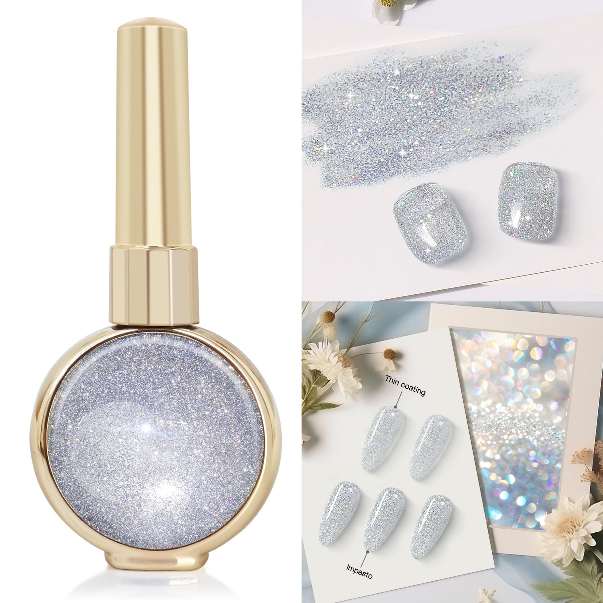 Infused with ultra-fine reflective glitters, it delivers an ethereal shine, multidimensional depth, and a polished, high-luxury finish. Whether used alone or layered over color, it brings instant luminosity and elegance to every manicure.